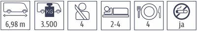 Alle Typen dieser Klasse sind mit einem Festbett im Fahrzeugheck und einem weiteren Festbett als Hubbett überhalb der Fahrersitze ausgestattet und bieten eine Schlafgelegenheit für 4 Personen. Der großzügige Wohnraum verfügt über eine großzügige Küche mit Kühlschrank, einer Mittelsitzgruppe, einem Bad mit WC und einer separaten Dusche - so ist maximaler Reisekomfort garantiert.